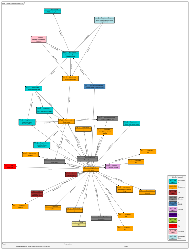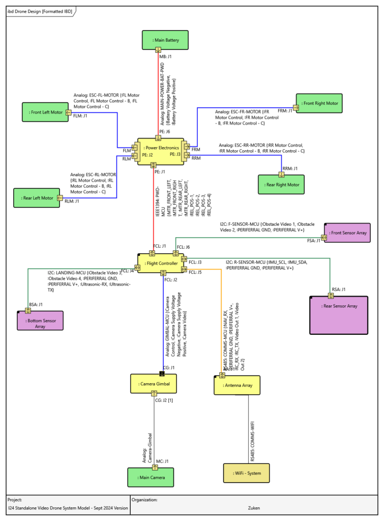 The system of interest is a commercial drone built for aerial photography and video capture. The company responsible for designing the drone is Super Drone Design, while manufacturing is outsourced to Mega Manufacturing. Super Drone Design has implemented MBSE as a methodology for product development and has an drone product family architecture that includes requirements, system context definition, use cases, functional definition, physical architecture decomposition, and behavioral simulation. The model also contains constraints and parameters necessary to perform trade studies.