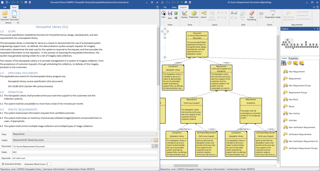 To streamline requirements capture and accelerate your project startup, Vitech’s software has a variety of parsers to help you capture requirements for your project with a minimum of effort. Parse from documents, spreadsheets, and databases, or directly author your requirements in GENESYS. Load requirements, function lists, parts lists, and standards to accelerate your engineering effort. Autoname entities, automatically establish a requirement hierarchy, and break out compound statements into child-level functional requirements as you establish dependencies and traceability.
