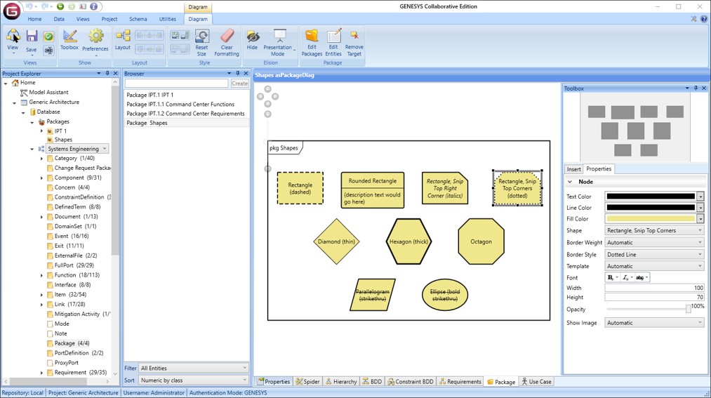 Within GENESYS, the diagram properties set the overall format of the diagram—what information is shown on each node; coloring for nodes, lines, and the diagram itself; sizing; specific diagram options. GENESYS 2020 R2 dramatically increases the range of formatting options you can apply to nodes and lines. Previously you could set size, color, opacity, and whether to display a node as a box or an image. Now you can choose from 9 different node shapes, 3 line weights, 3 line styles, font styles, and even change the template for a specific node or line to present your information your way with maximum flexibility.