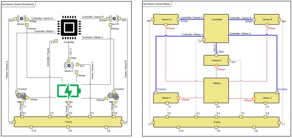 Manual formatting is good, but automated formatting is even better. Define rules—no programming required—to control the formatting of your diagrams. And with so much formatting at your control, you can now have multiple views of the same diagram (or viewpoint if you prefer). Lay out your base internal block diagram to show the complete technical system schematic. Store a different view using graphics to create an architoon for stakeholders. Use rule-based elision to create a different view for each type of connection: structural, electrical, data, etc.